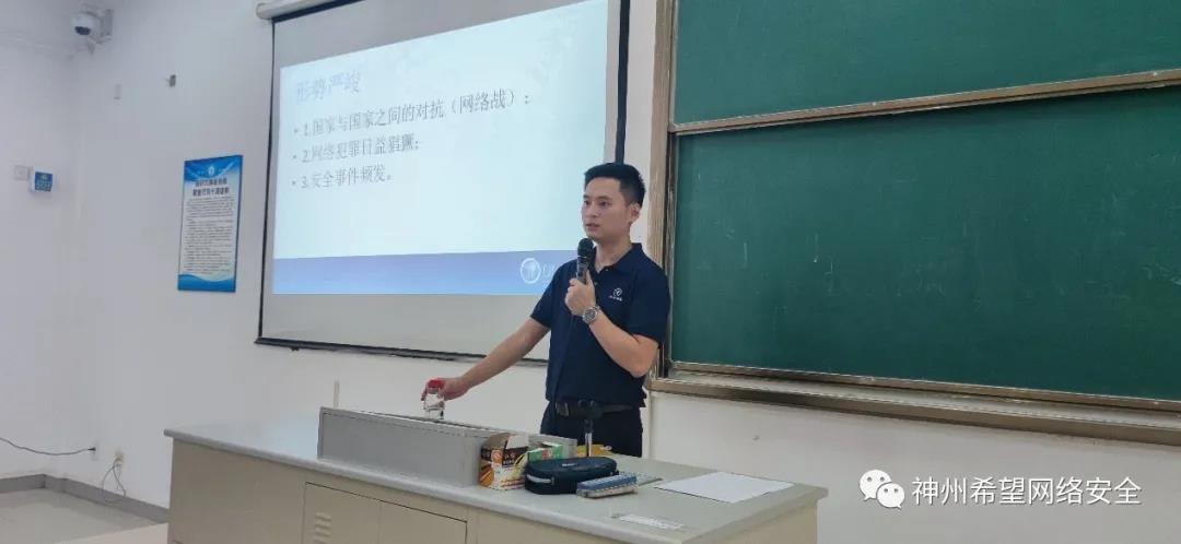 接着,海南神州希望网络有限公司网络安全事业部总监陈超给同学们介绍网络安全等级保护工作情况。随着云计算、移动互联、工控系统、物联网及大数据等新技术应用,为了适用新技术发展要求,等保从1.0进入到了等保2.0时代,在原先的信息安全等级保护工作制度的基础上,将网络安全涉及到的安全审查、检测评估、安全监测、通报预警、案事件调查、数据防护、灾难备份、应急处置、自主可控、供应链安全、效果评价、综治考评等与网络安全相关的工作要求全部纳入其中,统称为网络安全等级保护制度,并加以实施。